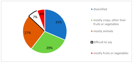 According to the data presented in Figure 1, the sample is diverse in terms of the predominant production profiles on farms: in just below 1/3 of the villages, the production profile is diversified, and the numbers are slightly lower for crop production and animal production.