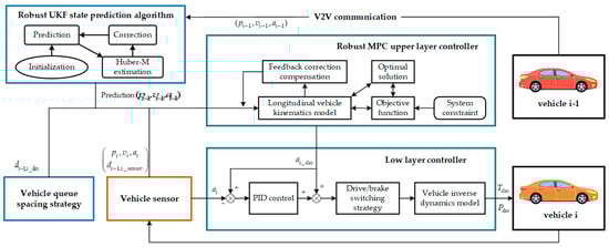 Design the longitudinal controller of vehicle i as an upper and low layer. The upper controller obtains the state information of vehicle i − 1 and the state information of vehicle i through the V2V communication to decide the desired acceleration. The low controller controls the acceleration and deceleration of vehicle i according to the desired acceleration. Considering that V2V communication has the problems of random communication delay and data loss, the robust UKF algorithm is used to estimate the state information of the vehicle under the influence of the communication problem. The specific control framework is shown in Figure 2.
