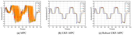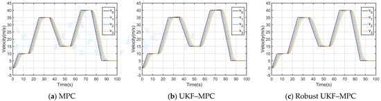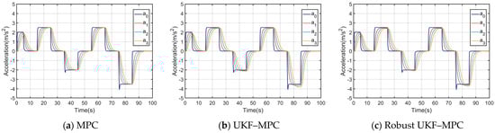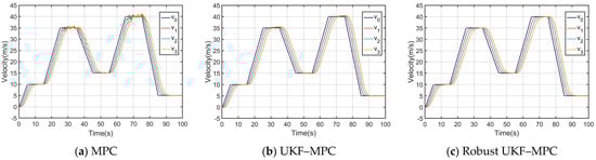 The robust UKF–MPC longitudinal controller of this paper is compared and analyzed with the MPC longitudinal controller and the improved UKF–MPC longitudinal controller based on UKF in the scenarios with and without communication delay and data packet loss problems, and the simulation results are shown in Figure 3, Figure 4, Figure 5, Figure 6, Figure 7 and Figure 8.