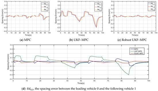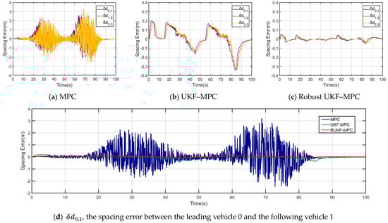 Under the condition of no communication delay and packet loss, as shown in Figure 3 and Figure 4, the speed and acceleration under the three controllers can stably follow the speed and acceleration of the front vehicle to ensure the stability of the longitudinal motion of the vehicle platoon; however, when comparing the inter-vehicle spacing errors of the vehicles controlled by the three controllers, the inter-vehicle spacing error under the MPC longitudinal controller is about 0.1 m, under the UKF–MPC longitudinal controller is about is 0.3 m, and the workshop distance error under the robust UKF–MPC longitudinal controller is about 0.04 m, as shown in Figure 5. It can be seen that the robust UKF–MPC longitudinal controller in this paper improves the control accuracy of the longitudinal motion of the vehicle platoon compared to the MPC longitudinal controller and the UKF–MPC longitudinal controller under the condition of no communication delay and packet loss.