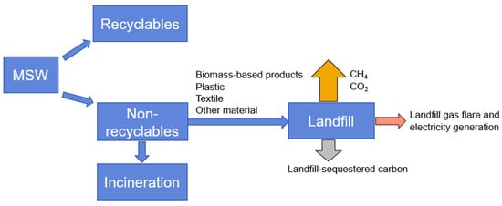 Figure 1 shows the typical fate of MSW in common landfilling practice. After separation of non-recyclables and diversion for incineration, the remaining MSW is sent to landfill. The fates of the landfilled carbon are landfill-sequestered carbon (solid carbon that does not degrade into a gas), landfill gas (which is captured and either flared or converted into electricity and heat) or emitted mainly as CH4 or CO2 into the atmosphere.