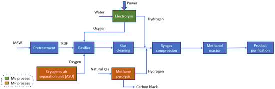 - Ostadi, M.; Bromberg, L.; Cohn, D.R.; Gençer, E. Flexible methanol production process using biomass/municipal solid waste and hydrogen produced by electrolysis and natural gas pyrolysis. Fuel 2023, 334, 126697. [Google Scholar] [CrossRef]