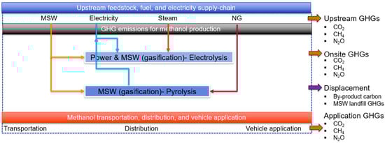 Thermochemical gasification conversion of MSW to methanol with increased methanol production using hydrogen enhancement is considered here as a potential path for valorization of MSW. Relative to methanol produced from natural gas (or coal), this process reduces GHGs by using the biomass-based carbon and hydrogen in MSW and by adding low-carbon hydrogen. Relative to the landfilling of MSW, its conversion to methanol also reduces greenhouse gas by avoidance of methane that could otherwise be emitted from landfilling.