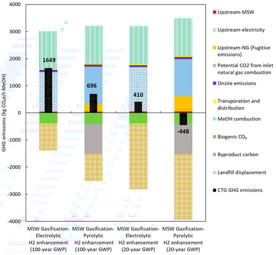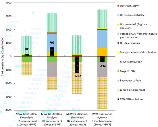 A representative number for all of the MSW that is landfilled in the US per year is 133 t []. For an illustrative case of 50% of this MSW (66 Mt/y) being converted into methanol, there would be net emissions of −36 MtCO2e/y with hydrogen enhancement from natural gas pyrolysis (based on Figure 5, using 20-year GWP). For hydrogen produced from electrolysis with renewable electricity, the net emissions would be −101 MtCO2e/y. These negative numbers mean that the methanol production from MSW that is redirected from landfilling can provide a greenhouse gas reduction relative to the present landfilling process.