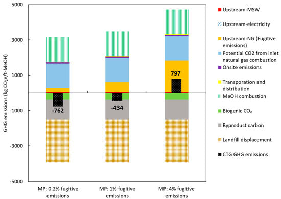 Impact of natural gas fugitive emissions on the GHG emissions of the MP process, using renewable electricity and 20-year GWP. The middle black bar represents the net GHG emissions.