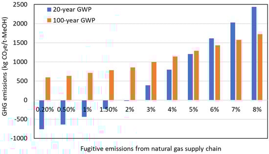 The impact of a wider range of natural gas fugitive emissions on the GHG of MP process for both 20-year and 100-year GWP using renewable electricity is shown in Figure 7. For the fugitive emissions less than 2%, the 20-year impact is negative, meaning the produced fuel contributes to GHG emissions reduction from the atmosphere; meanwhile for fugitive emissions more than 2%, the 20-year impact becomes positive, and for percentages above 5%, the 20-year impact exceeds the 100-year impact. With 8% fugitive emissions, the GHG emissions with 20-year impact are roughly close to the LCA of methanol from conventional natural gas-based methanol (2500 kg CO2e/t MeOH []). The 100-year impact is always positive, meaning the fuel adds to the inventory of GHGs in the atmosphere.