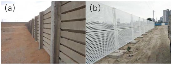 Commonly used windbreak structures. (a) Inclined-inserted windbreak. (b) Hole-plate sand fence.