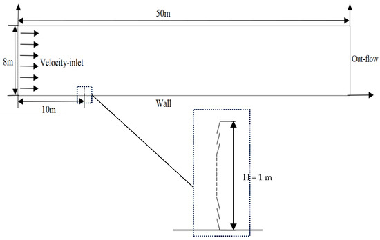 For this study, the dimensions of the computational domain are specified as 50 m in length and 8 m in height, as shown in Figure 2. The modeled sand fence has a height of 1 m, a thickness of 0.004 m, a pore size of 0.014 m, and a porosity of 0.2. The velocity inlet is 10 m from the sand fence, and the velocity outlet is 40 m from the sand fence.