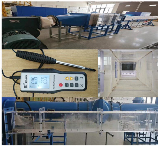 The wind tunnel tests (Figure 3) discussed in this paper were conducted in the small-scale low-speed DC wind tunnel laboratory at Xinjiang University. The wind tunnel has a total length of 10 m, with a test section measuring 3.5 m. The wind speed within the test section can be continuously adjusted from 0 to 30 m/s. The Reynolds number for the tests ranges from 0 to 1.34 × 106, and the turbulence intensity is maintained at less than 1%.