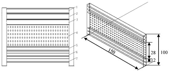The new sand fence model used in the wind tunnel tests is shown in Figure 4. This model primarily comprises two columns, six inclined inserts, and one aperture plate. The configuration includes No.1, No.2, and No.3 slanting plates installed in the upper part of the column. In contrast, the No.4 aperture plate, characterized by a 20% porosity, is positioned in the middle part of the column. Additionally, No.5, No.6, and No.7 slanting plates are installed in the lower part of the column. The overall height of the sand fence is 100 mm. The dimensions of the inclined insert plates are 150 mm in length and 12 mm in height, adhering to a model scale of 1:10 [26]. Meanwhile, the aperture plate measures 150 mm in length and 28 mm in height. The inclined insert and the open plate thickness are 5 mm.
