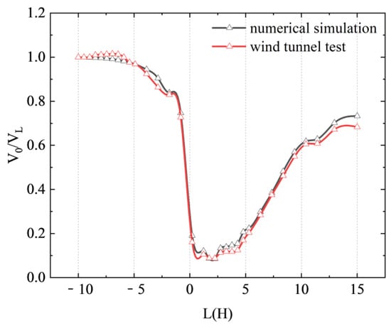 Figure 5 shows the relative wind speed around the sand fence wall obtained from numerical simulations and wind tunnel tests. In this context, H is the height of the sand fence wall, and L is the distance from it, with positive numbers representing the windward side and negative values indicating the leeward side. V0 refers to the inlet wind speed, VL is the wind speed at a specific point within the computational domain, and V0/VL represents the relative wind speed. The data reveal that the relative wind speed distribution forms an approximate ‘V’ shape as a function of distance. Notably, the patterns in relative wind speed with distance obtained by both methods are essentially consistent, demonstrating the excellent reliability of the numerical simulation results.
