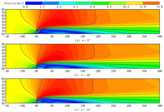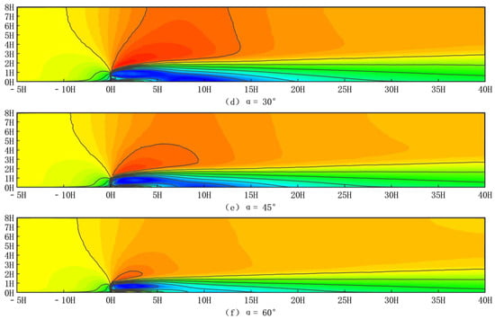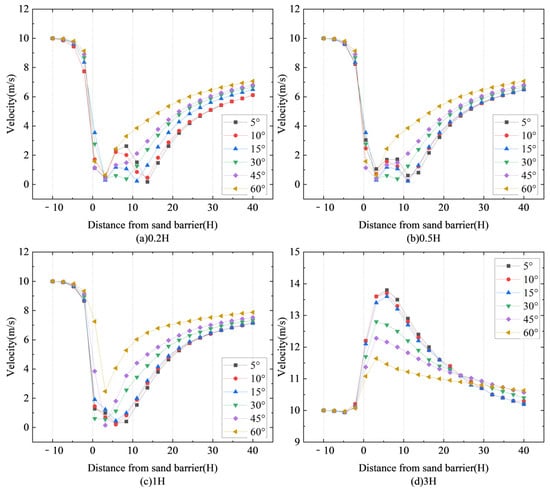 Figure 7 depicts the horizontal wind speed pattern around a novel type of sand fence with different inclination angles of inclined inserts. Figure 7a depicts the horizontal wind speed at 0.2H above the ground, and Figure 7b depicts the horizontal wind speed at 0.5H above the ground. Figure 7c and Figure 7d depict the horizontal wind speed at 1H and 3H above the ground, respectively.