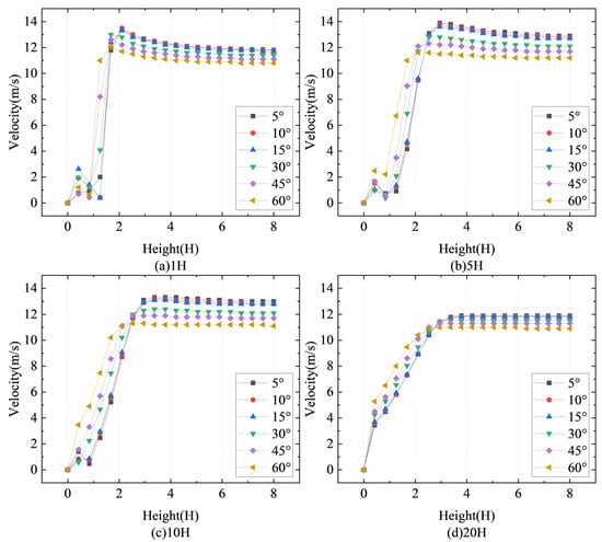 Figure 8 shows the variation in vertical wind speed around the new sand fence at various inclined insertion angles. Figure 8a displays the vertical wind speed at a distance of 1H from the sand fence, whereas Figure 8b displays the vertical wind speed at a distance of 5H from the sand fence. Figure 8c displays the vertical wind speed at a distance of 10H from the sand fence, whereas Figure 8d displays the vertical wind speed at a distance of 20H from the sand fence.