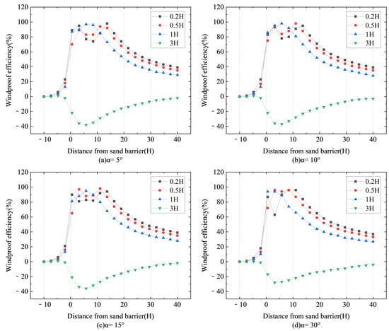 Figure 9 selects four heights of 0.2H, 0.5H, 1H, and 3H, and calculates the windproof efficiency of six different inclined sand fences according to Formula (4). Figure 9a shows the windproof efficiency at a tilt angle of 5°; Figure 9b shows the windproof efficiency at a tilt angle of 10°; Figure 9c shows the windproof efficiency at a tilt angle of 15°; and Figure 9d shows the windproof efficiency at a tilt angle of 30°.