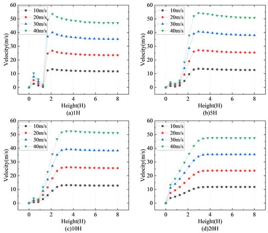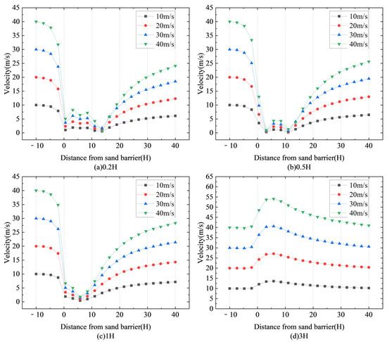 Figure 10 depicts the differences in horizontal wind speed at various heights surrounding the sand fence for wind speeds of 10 m/s, 20 m/s, 30 m/s, and 40 m/s. Figure 10a shows the horizontal wind speed at an altitude of 0.2H, whereas Figure 10b shows the horizontal wind speed at an altitude of 0.5H. Figure 10c and Figure 10d show the horizontal wind speed at 1H and 3H altitudes, respectively.