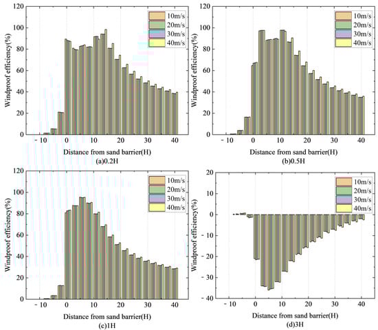 Figure 12 shows the windproof effectiveness of sand fences at various wind speeds. Figure 12a shows the windproof efficiency at 0.2H above ground, while Figure 12b shows the efficiency at 0.5H. Figure 12c depicts windproof efficiency at a height of 1H above the ground, while Figure 12d displays efficiency at a height of 3H.