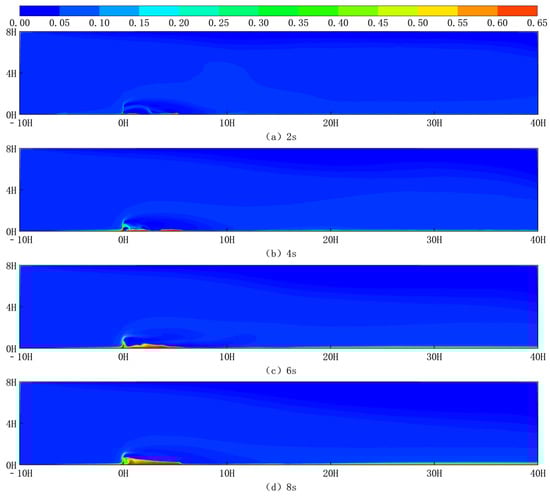 Figure 13 shows the sand cloud at different moments at 10 m/s for the new sand fences with 15H spacing. Figure 13a depicts the collected sand cloud at 2 s, Figure 13b depicts the accumulated sand cloud at 4 s, Figure 13c depicts the accumulated sand cloud at 6 s, and Figure 13d represents the accumulated sand cloud at 8 s. As shown in the diagram, when sand-laden wind enters the flow field area through the left velocity intake, it hits a new sand fence. This interaction reduces wind speed, resulting in a decrease in sand-carrying capacity. As a result, sand particles begin to deposit mostly on the leeward side of the sand fence, albeit some accumulate on the windward side.