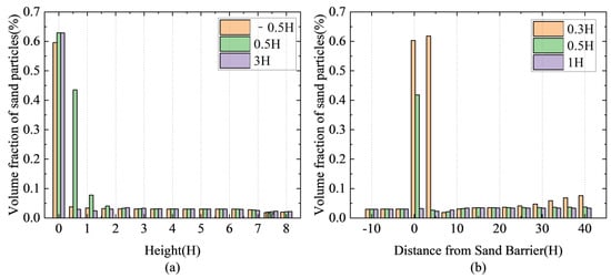Figure 14a depicts the volume percentage of sand particles at different heights relative to the first row of sand fences, namely −0.5H, 0.5H, and 3H. The statistics show that when the height is less than 1H, the volume fraction of sand particles in all three positions is much larger than when the height exceeds 1H. This pattern reveals a significant drop in the volume fraction of sand particles as height increases. It shows that the sand fences cannot effectively intercept sand particles above the height of the fences.