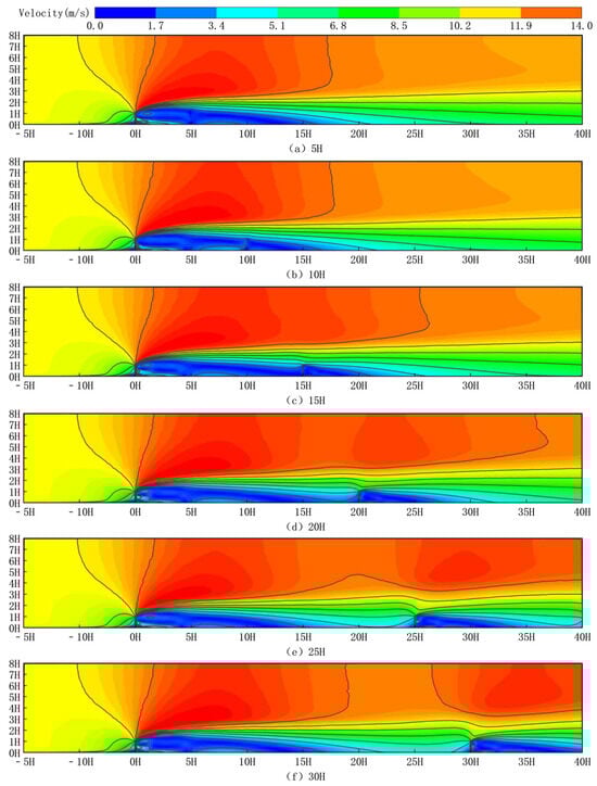 Figure 15 depicts wind speed cloud maps for six configurations of double-row sand fences, each with a different spacing, at a wind speed of 10 m/s. Specifically, Figure 15a illustrates the wind speed distribution for a double-row spacing of 5H, while Figure 15b depicts a scenario with a spacing of 10H. Similarly, Figure 15c shows the wind speed cloud map for a spacing of 15H, and Figure 15d represents the configuration with a 20H spacing. Furthermore, Figure 15e and Figure 15f display the wind speed distributions for spacings of 25H and 30H, respectively.