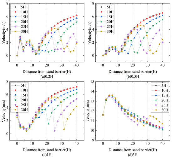 Figure 7d shows that the velocity change of the sand barricade at 3H from the ground is the same as that of the other three heights, and the overall velocity curve shows an inverted ‘V’ shape distribution. This demonstrates that the wind protection impact of the sand fences at the height of 3H is weak, with the main protective range being the height below the sand fence.