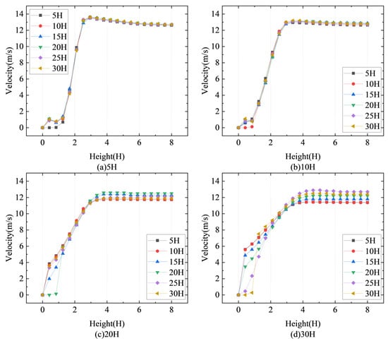 Figure 11 depicts the vertical fluctuation in wind speed around the sand fence under various wind conditions. Figure 11a shows the vertical wind speed at a distance of 1H from the sand fence, whereas Figure 11b shows the vertical wind speed at a distance of 5H. Figure 11c depicts the vertical wind speed at a distance of 10H, whereas Figure 11d displays the vertical wind speed at a distance of 20H from the sand fence.
