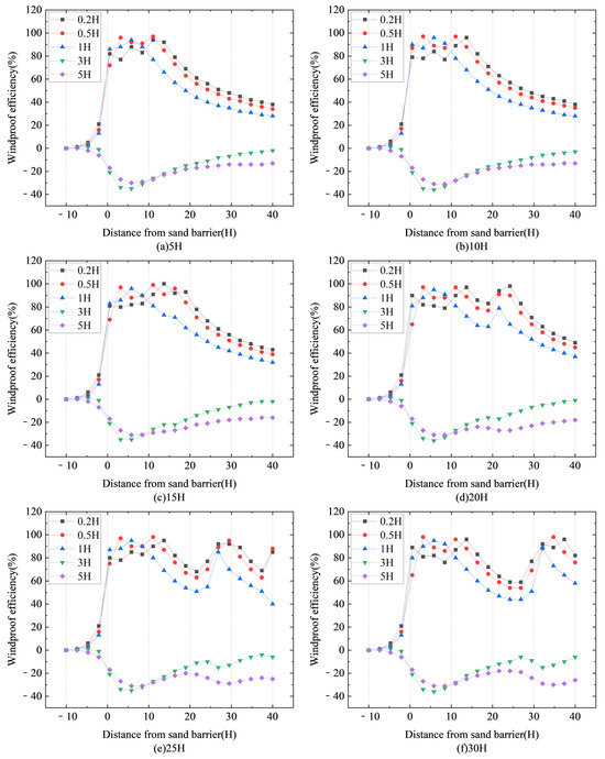 Figure 18 illustrates the windproof efficiency of six different spacing configurations for double-row sand fences, calculated using Formula (4). Specifically, Figure 18a illustrates the efficiency for a spacing of 5H. Similarly, Figure 18b depicts the windproof efficiency for a spacing of 10H, while Figure 18c shows the efficiency for a spacing of 15H. Furthermore, Figure 18d demonstrates the windproof efficiency for a spacing of 20H, and Figure 18e illustrates the efficiency for a spacing of 25H. Finally, Figure 18f illustrates the efficiency for a spacing of 30H.