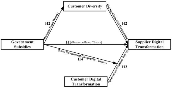 Government subsidies can enhance the diversity of local suppliers’ downstream customers through several ways. Firstly, government subsidies can help suppliers reduce the cost of entering new markets [22,23]. Secondly, government subsidies can be allocated to hire market access consultants who provide suppliers with professional advice on the laws and regulations, market demand, and competitive landscape of target markets. These consultancy services help suppliers gain a precise understanding of new market requirements, formulate effective market entry strategies, and reduce the challenges and uncertainties associated with entering new markets [24,25]. Thirdly, government subsidies support suppliers in conducting targeted R&D to develop products or services tailored to the needs of local markets [26,27]. This targeted R&D enables suppliers to offer more competitive and relevant products in diverse markets. Fourthly, government subsidies enable suppliers to participate in international exhibitions, business seminars, and industry exchange activities. These platforms help suppliers establish connections with potential customers and partners, increase corporate exposure, enhance market recognition, and open up new sales channels [28,29,30]. Through these measures, suppliers can significantly expand their market coverage and diversify their customer base.