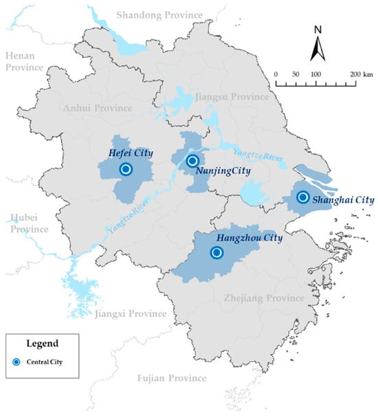 Based on the principles of similar city positioning, development level, development characteristics, and urban rank, this study selects Shanghai City, Nanjing City, Hangzhou City, and Hefei City as the central cities of the YRD urban agglomeration. Shanghai City is a municipality directly under the central government, while Nanjing City, Hangzhou City, and Hefei City are the provincial capitals of the Jiangsu, Zhejiang, and Anhui provinces, respectively (Figure 1). The combined GDP of these four cities exceeds 9.35 trillion yuan, with a total permanent resident population of 56.2 million, making them representative in regional development. The economic and demographic information of the four cities is shown in Table 1.