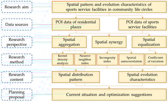 Based on POI data representing various types of sports service facilities within community life circles, this study analyzes the spatial patterns and evolutionary characteristics of these facilities in the central community life circles of the Yangtze River Delta (YRD). The analysis is conducted from the perspectives of spatial aggregation, coordination, and equalization. Methods employed include kernel density analysis, the nearest neighbor index, spatial autocorrelation, and coefficient of variation. These techniques are used to investigate the spatial patterns and evolutionary trends of sports service facilities, identify existing issues, and propose optimization measures. The technical route is shown in Figure 2.