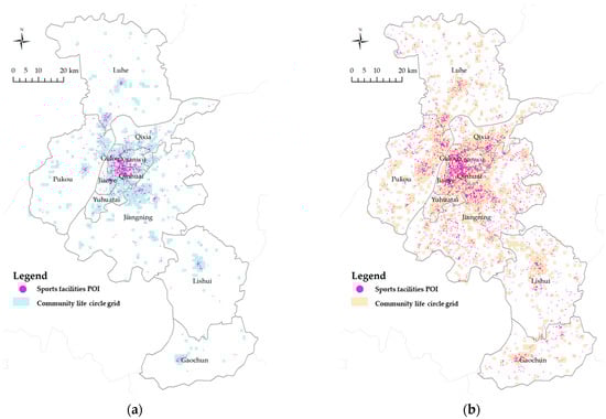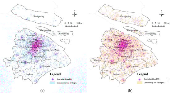 A schematic diagram of sports service facilities in community life circles of Shanghai City. (a) Data for 2013; (b) Data for 2023.