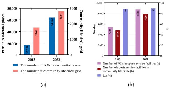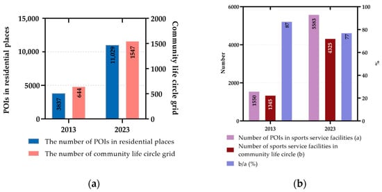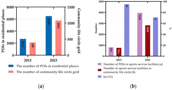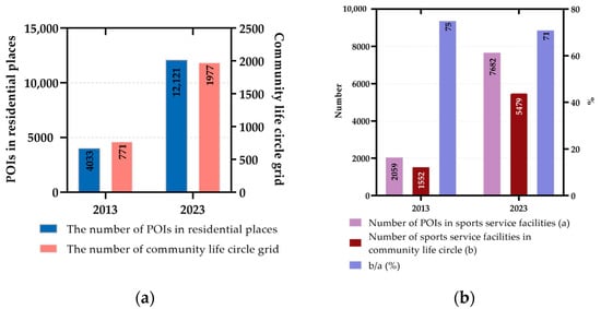 Statistics on the number of community life circles and sports service facilities in Hefei City. (a) Statistics on number of POI in residential places and community life circle; (b) Statistics on number of POI in sports service facilities and sports service facilities in community life circles.