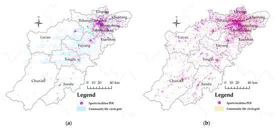 A schematic diagram of sports service facilities in community life circles of Hangzhou City. (a) Data for 2013; (b) Data for 2023.