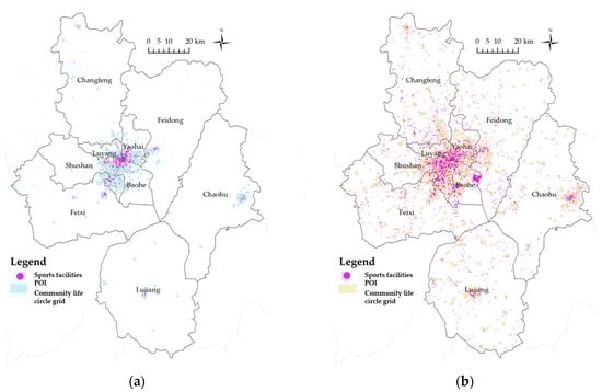 A schematic diagram of sports service facilities in community life circles of Hefei City. (a) Data for 2013; (b) Data for 2023.