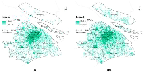 The kernel density estimation results of sports service facilities in Shanghai City. (a) Data for 2013; (b) Data for 2023.