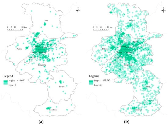 The kernel density estimation results of sports service facilities in Nanjing City. (a) Data for 2013; (b) Data for 2023.