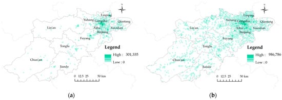 The kernel density estimation results of sports service facilities in Hangzhou City. (a) Data for 2013; (b) Data for 2023.