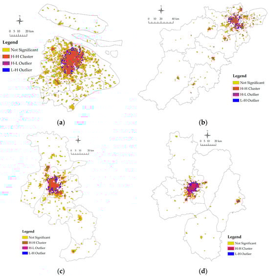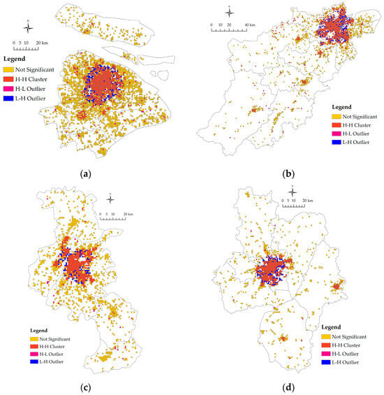 Local spatial autocorrelation analysis primarily uses the Anselin Local Moran’s I Index, with results presented in four forms: (1) High–High clusters (H–H); (2) Low–High outliers (L–H), where low values are surrounded by high values; (3) Low–Low clusters (L–L); (4) High–Low outliers (H–L), where high values are surrounded by low values []. The formula for Ii is: