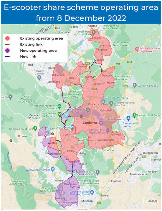 Areas within Canberra licenced to operate e-scooters from December 2022. (Source: [90]).