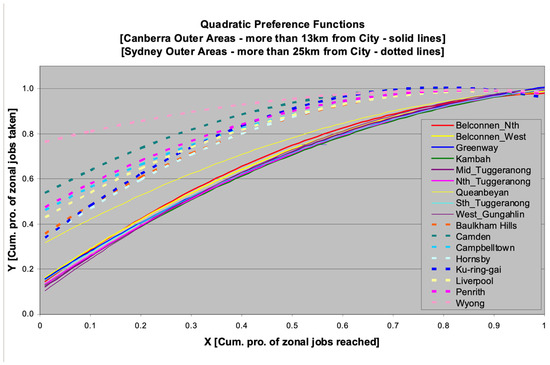 One way of establishing an answer to this question is to draw on the theory of intervening opportunities [101] as applied in trip distribution modelling by Ruiter [102]. The model can be operationalised by calculating, from each residential origin zone in turn to destination zones arranged at increasing distance from the origin zone, the cumulative proportion of jobs by zone (including the origin zone) that are reached using Census data—Journey-to-Work tabulations. By expressing the numbers as the proportion of metropolitan jobs, the methodology can be applied to both intra-metropolitan zones and zones in other cities, such as a comparison of the outer suburbs of Canberra and the outer sprawling suburbs of Sydney.