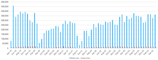 Canberra light rail system monthly boardings (tickets and Smart Card, MyWay) from April 2019 to May 2024 (Source: Authors’ analysis of data found at ACT Government Open Portal, https://www.data.act.gov.au/, accessed on 27 February 2024).