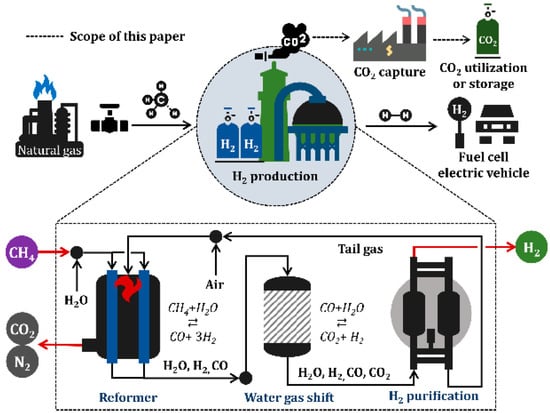 - Lee, S.; Kim, H.S.; Park, J.; Kang, B.M.; Cho, C.; Lim, H.; Won, W. Applied Sciences Scenario-Based Techno-Economic Analysis of Steam Methane Reforming Process for Hydrogen Production No Research Hydrogen Emission. Appl. Sci. 2021, 11, 6021. [Google Scholar] [CrossRef]