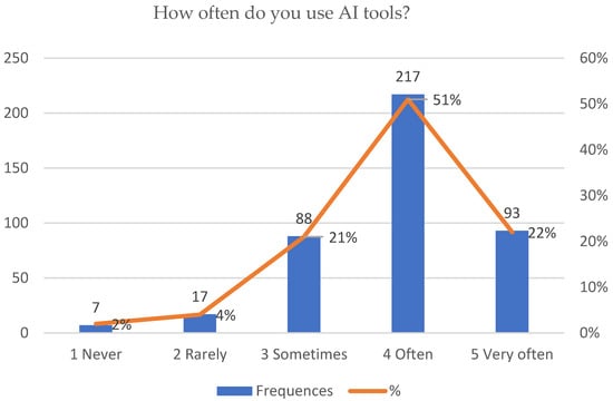 First, we asked students about the frequency and purpose of using AI tools. According to the collected data presented in Figure 1, half of the surveyed students (51%) use AI tools often, 22% very often, 21% sometimes, 4% rarely, and just 2% of them do not use these tools at all. The average of the data in Figure 1 is 3.9 with a standard deviation of 0.9.