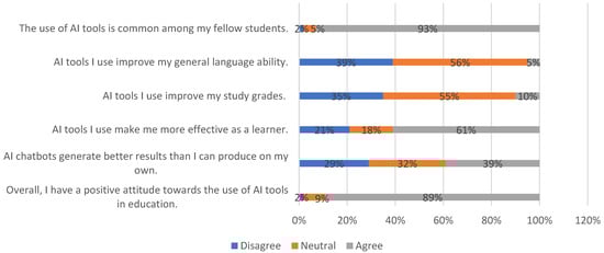 We also studied students’ attitudes towards using AI tools in an educational context. We examined six distinct statements, reflecting various aspects of using AI tools. The statements were analyzed in terms of the respondents’ agreement levels: disagree, neutral, and agree.