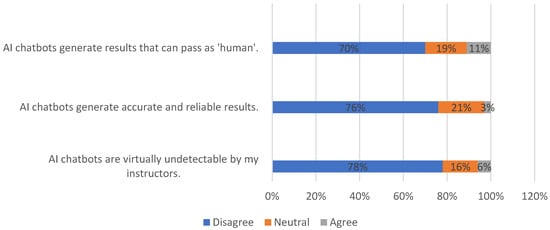 At the end, we analyzed students’ perceptions of results generated by AI tools in an academic context (Figure 4). We observed three specific perceptions: whether AI chatbots are virtually undetectable by instructors, whether AI chatbots generate accurate and reliable results, and whether AI chatbots generate results that can pass as ‘human’. As above, we utilized a 3-point Likert scale: (1) disagree, (2) neutral, and (3) agree.