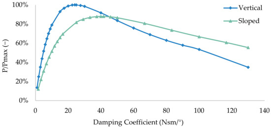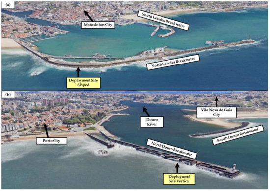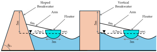 Hence, this study aims to investigate, optimize, and experimentally validate a hinged WEC technology for producing electricity from waves, consisting of a single floater attached to a movable arm, as well as to compare and understand the effects of different breakwaters’ geometries in the device performance. To achieve that, two breakwaters’ configurations (sloped and vertical) associated with two existing locations in Porto, Portugal, were analyzed and discussed. The first breakwater is of the sloped type and was based on the north breakwater of the Port of Leixões and the second is of the vertical type, based on the north breakwater of the Douro River (