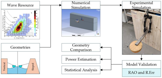 14]. Furthermore, numerical simulations were made to support the performance assessment by using proper simulation software; by doing so, it was possible to predict the expectable power output of the device. Additionally, an experimental model in the scale 1:14 was built to test and validate the numerical simulations in a wave current flume tank. Finally, a statistical study was developed to better understand the relation between the factors determining the system response, namely, the significance wave height, wave direction, and wave period.