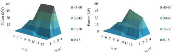Finally, the maximum desirability of the model is reached by varying the factors until the four responses are the highest possible (considering that both CWR and power output are to be maximized). Within the dataset analyzed, such configuration happens to be with 3 m of Hs, 6 s of Tp, and 90° of incident wave direction. Crossing these data with the wave resource distribution, it is possible to quickly assess the potential of a hinged WEC in a particular location. The closer the wave resource to the perfect configuration layout, the higher will be the production and the efficiency of the device.