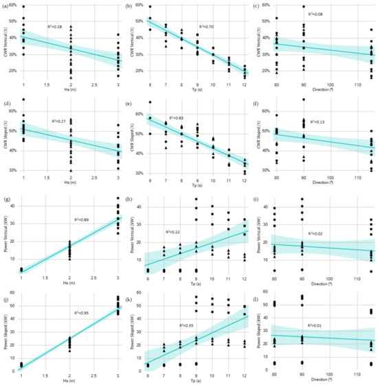 Once again, the relationship between Hs and the device’s power and Tp with efficiency became clear. From the model equations shown together with the straight lines, it is possible to verify that the models related to the CWR do not even present Hs or even the direction in their terms.