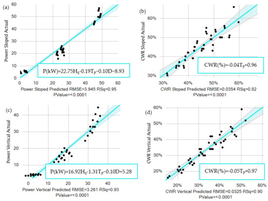 Figure 12 displays the model adjustments using the data obtained during the numerical simulation versus the data predicted by the models. All of the four models achieved higher values of correlation (higher than 0.80), proving the capacity of using mathematical models as good tools while assessing hinged WEC feasibility for a given wave resource in certain location. However, it is important to mention that these mathematical models were produced with a limited range of values and configurations, a fact that restricts their application only to extrapolations to the model itself. Nevertheless, they do not fail to fulfill the role of proving the possibility of using models to predict efficiencies and productions based on wave resources.