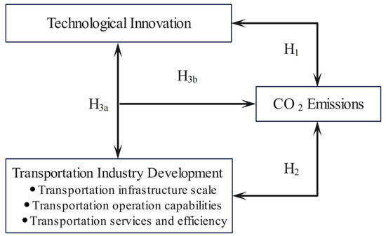 In the 21st century, climate change and resource scarcity have emerged as dual challenges worldwide. China, as a responsible member of the international community, bears significant responsibility for spearheading the global ‘green economic recovery’ [1]. The International Energy Agency reports that China’s transportation industry ranks as the third largest contributor to national greenhouse gas emissions, following the industrial and construction sectors. Reforming transportation infrastructure, network design, and service quality can impact 80% of direct and indirect CO2 emissions, playing a pivotal role in achieving China’s ‘dual carbon’ goal [2,3]. Furthermore, technological innovation-driven progress is vital in addressing environmental pollution and mitigating CO2 emissions [4]. Prioritizing technological innovation has become a key strategy for China to foster a low-carbon economy, establish a resource-efficient and eco-friendly society, and enhance national competitiveness [5]. In sum, transportation industry development and technological innovation are integral to CO2 reduction. In this sense, exploring their incorporation into the same framework and dynamic interactive effects with CO2 emissions is necessary, thereby guiding the endeavors targeting addressing the climate challenge of high CO2 emissions in China.